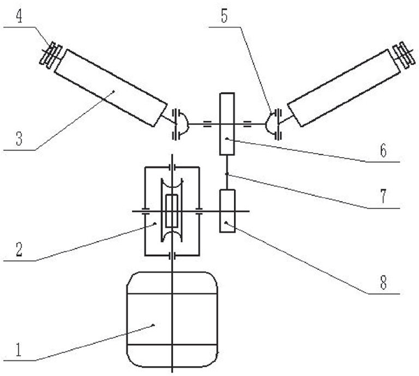 該V型滾筒輸送機(jī)采用單電機(jī)驅(qū)動,經(jīng)過蝸輪蝸桿減速機(jī)降速,然后由鏈條傳動將動力輸入到動力分配裝置,經(jīng)過動力分配裝置將動力轉(zhuǎn)化成雙側(cè)等功率輸出,再通過十字軸萬向節(jié)將動力傳遞給兩側(cè)的主動滾筒,主動滾筒另外一端安裝雙鏈輪,最后通過等距鏈條帶動其他滾筒連續(xù)運(yùn)轉(zhuǎn)。傳動系統(tǒng)原理圖如圖1所示。