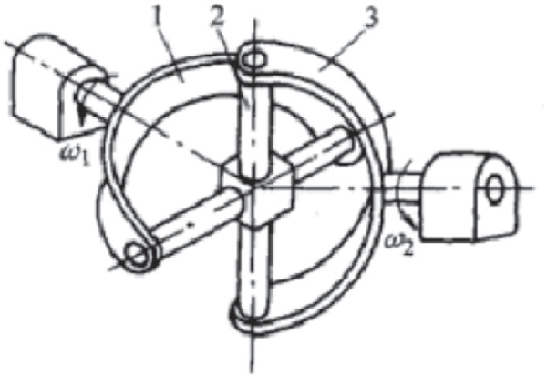 十字軸萬向聯(lián)軸器的結(jié)構(gòu)原理如圖2所示,主動軸、從動軸上的萬向節(jié)叉1、3中間的十字軸2分別以鉸鏈連接,當(dāng)兩軸有角位移時(shí),萬向節(jié)叉1、3繞各自軸線回轉(zhuǎn),而十字軸則做空間運(yùn)動。