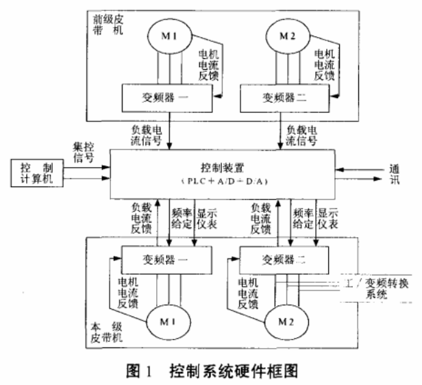 皮帶輸送機控制系統由變頻器、執行電機、控制裝置和負載電流檢測等組成??刂蒲b置由可編程邏輯控制器PLC、A/D及D/A轉換模塊等組成,其中變頻器由隔爆殼主腔、隔爆接線腔、本安控制腔、變頻調速控制系統、程序參數控制器組成,控制裝置由可編程邏輯控制器PLC、AD及D/A轉換模塊等組成。負載電流信號來源于各驅動皮帶機變頻器的電流反饋信號21,硬件框圖參見圖1。